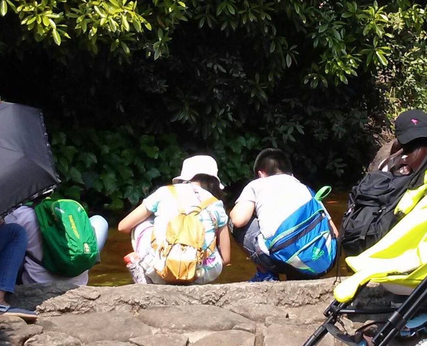 道中、おたまじゃくしの観察に夢中の二人。